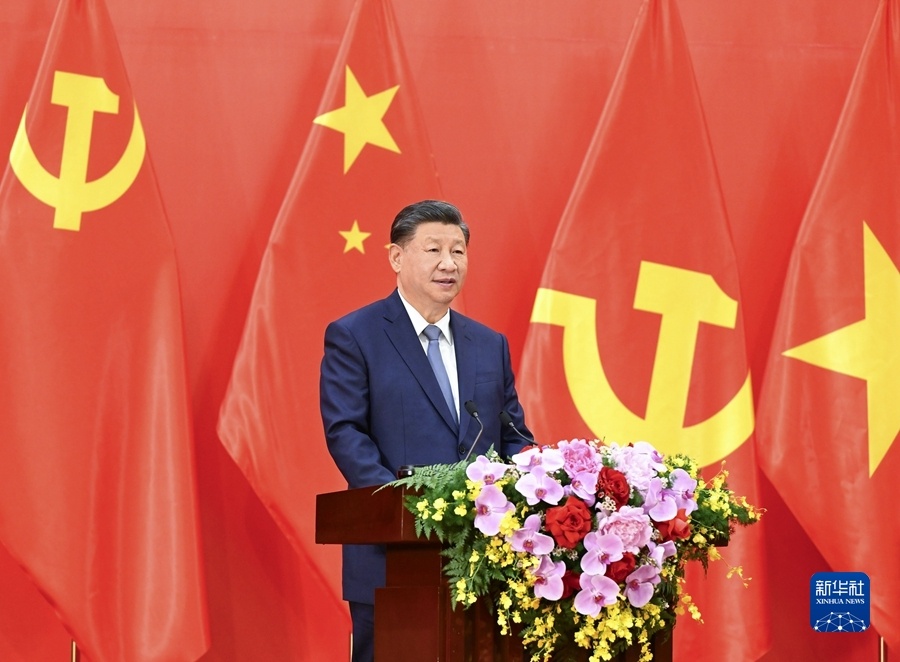 习近平代表中国党和政府向致力于中越友好的新老朋友致以亲切问候。习近平指出,昨天,我同阮富仲总书记一道宣布构建具有战略意义的中越命运共同体,开启了中越两党两国关系发展新阶段。这是我们从振兴世界社会主义和实现中越两国长治久安出发作出的重大战略决策,深深植根于中越传统友好,符合两国人民共同利益和共同愿望。