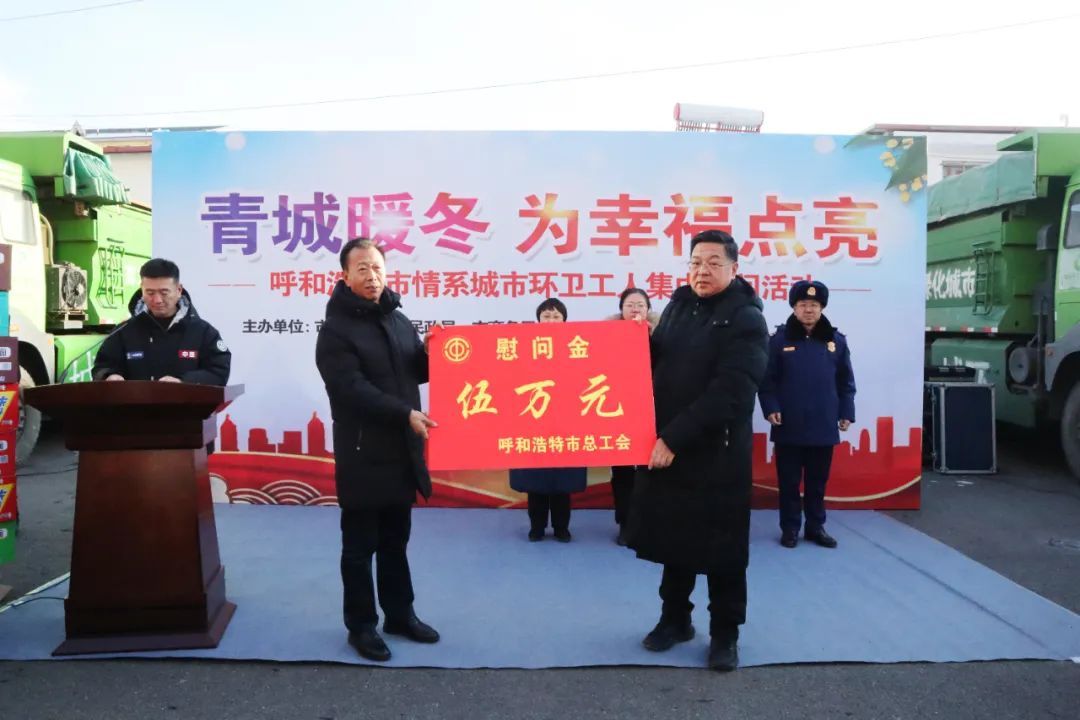 活动现场,呼和浩特市总工会为环卫职工带来5万元送温暖慰问金,同时向他们送上冬日的问候,对他们不辞劳苦、任劳任怨、不畏严寒的奉献精神表达了深深的敬意和诚挚的感谢。