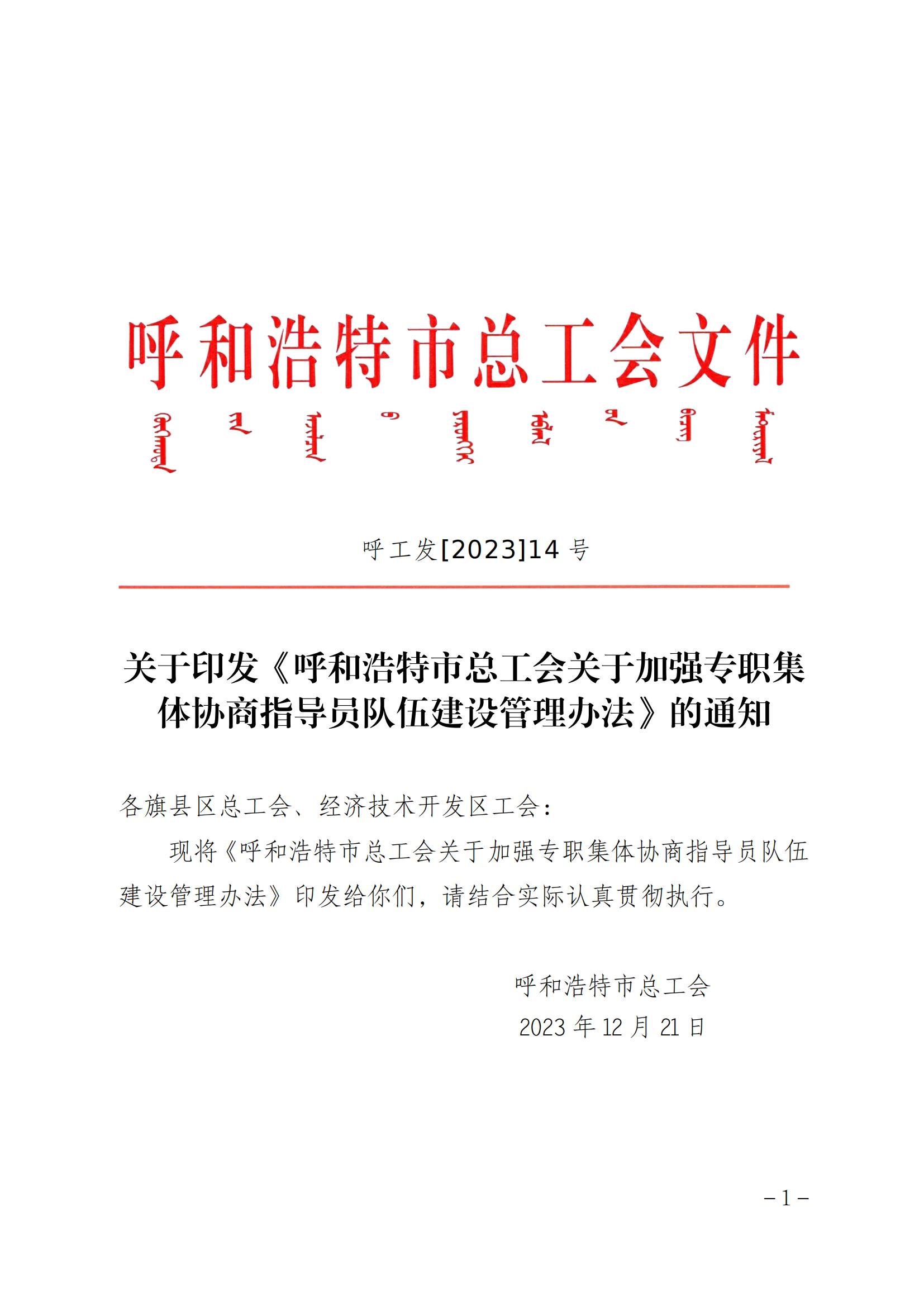 关于印发《呼和浩特市总工会关于加强专职集体协商指导员队伍建设管理办法》的通知_01