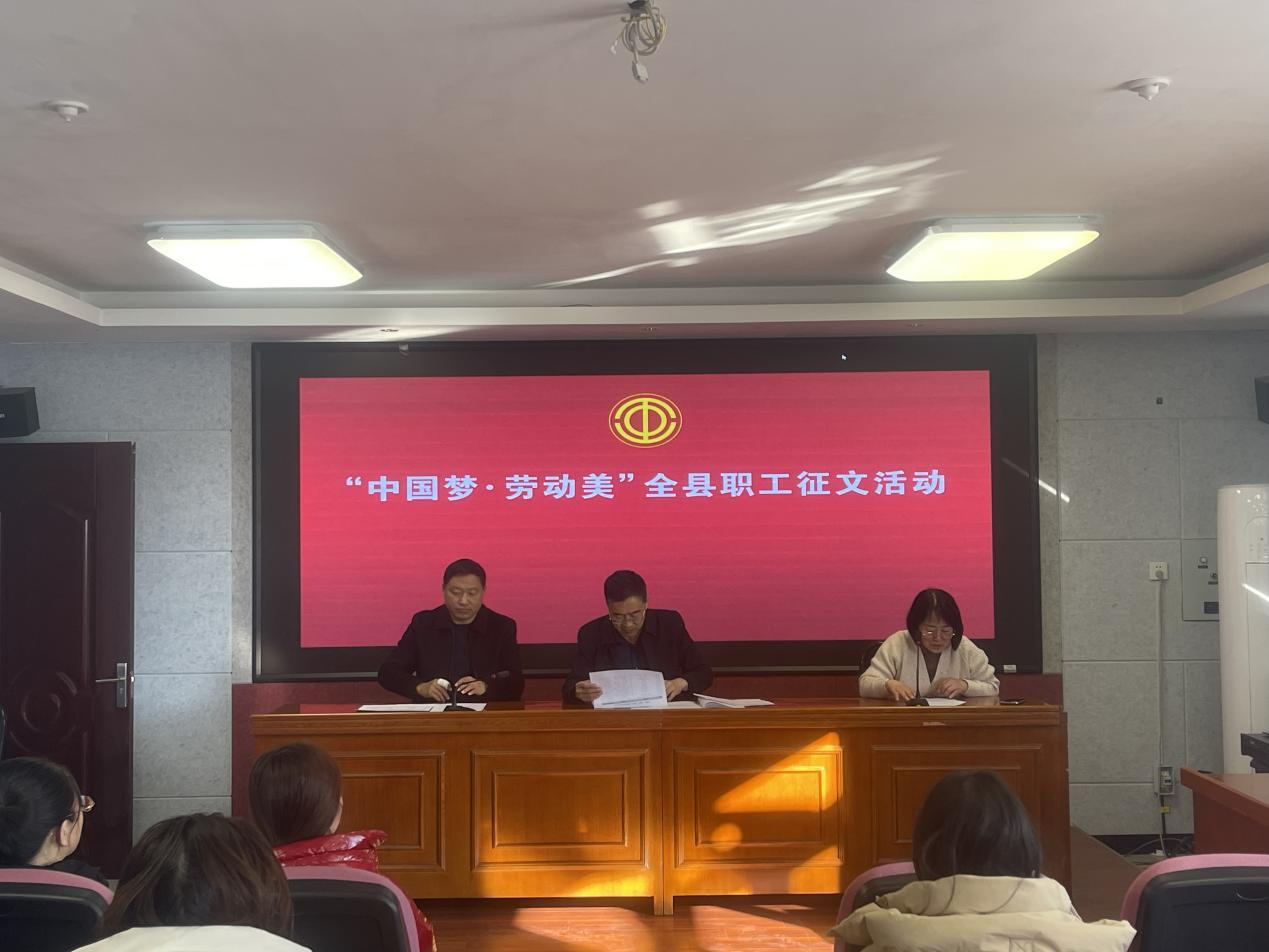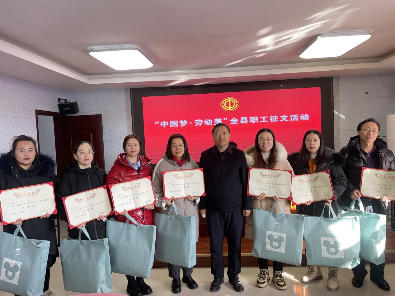 12月21日,县总工会举办的“中国梦·劳动美”全县职工主题征文活动颁奖仪式在县总工会四楼学习讲堂举行。县总工会主席蒲喜万,县总工会党组书记伊俊文出席颁奖仪式,县总工会党组成员、副主席孙瑞出席并主持颁奖仪式。
