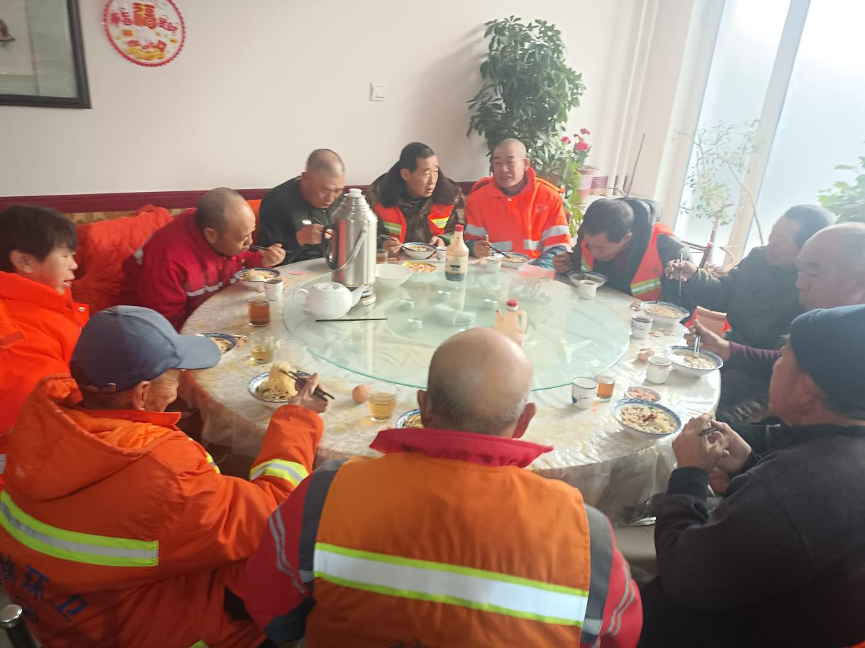 冬日的晨曦显得格外寒冷,沿着和林格尔县城关镇外环路整洁的街道走进一家名为虎威的农家饭店,店内不时传出开怀的笑声。与外边的清冷相比,店内显得热火朝天,身着橘红色工作制服的环卫工人吴长荣正同她的工友们有说有笑开心的一起吃着热乎乎、香喷喷的早餐。