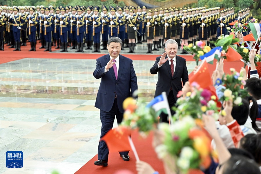 天安门广场鸣放21响礼炮,礼兵列队致敬。两国元首登上检阅台,军乐团奏中乌两国国歌。米尔济约耶夫在习近平陪同下检阅中国人民解放军仪仗队,并观看分列式。