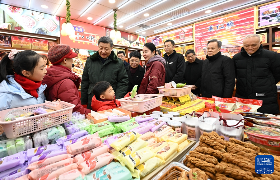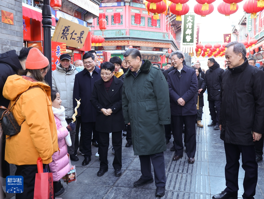 当天下午,习近平来到天津古文化街。街道古色古香,习近平沿街步行,先后走进桂发祥十八街麻花、果仁张、泥人张、杨柳青年画等特色店铺,了解产品种类、销售和传统文化传承发展等情况,同店铺业主、员工和现场群众互动交流。他说,各级党委和政府要加强节日期间民生商品的产销保供,确保数量充足、品类丰富、质量可靠,让广大群众放心消费、快乐过年。习近平指出,中国式现代化离不开优秀传统文化的继承和弘扬,天津是一座很有特色和韵味的城市,要保护和利用好历史文化街区,使其在现代化大都市建设中绽放异彩。