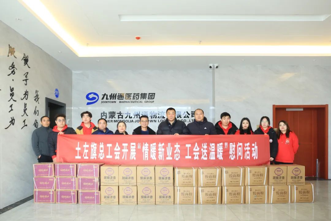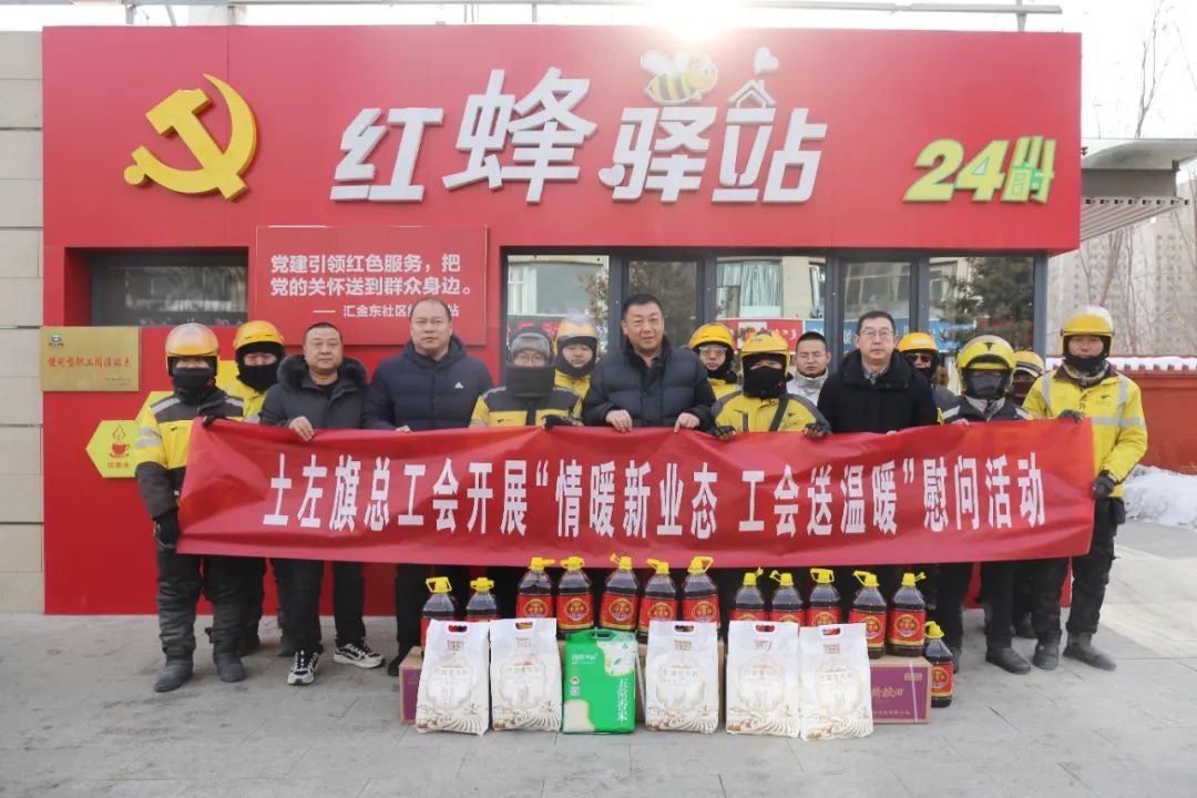 ▲土左旗总工会深入内蒙古九州通物流有限公司、土左旗汇金区域服务中心辖区内的“红蜂驿站”走访慰问新就业形态劳动者,为他们送去米、面、油等慰问品