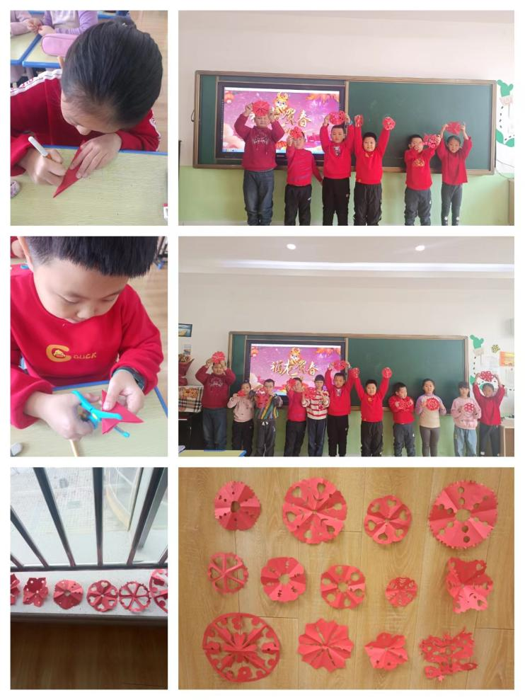 一张红纸,一把剪刀,一支笔,大家在描画窗花时全神贯注,一笔一画皆认真;剪裁窗花时大家不急不躁,一裁一剪皆灵巧。经过孩子们的努力,一条条代表着吉祥如意的窗花制作成功。大家一边欣赏自己独特的作品,一边拍照合影,现场欢声笑语不断。