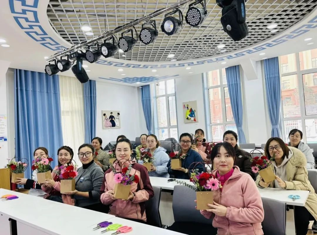 花香漫漫,每个座位上都放着精心准备的一束束鲜花、剪刀、花篮,教师们迫不及待,跃跃欲试。