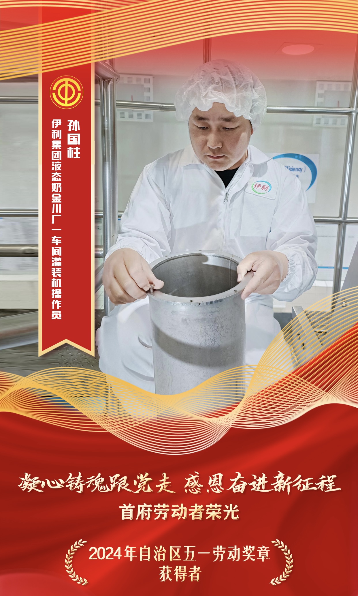 孙国柱是内蒙古伊利实业集团股份有限公司液态奶金川厂一车间的一名灌装机操作员。加入乳品行业10余年来,他一直兢兢业业,坚守“伊利即品质”的信条,在平凡的岗位上发挥着自己的光和热。