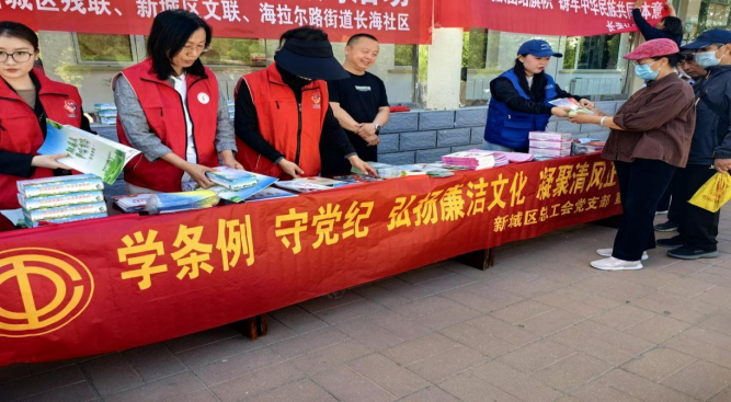 5月17日上午,新城区总工会联合新城区妇联、新城区团委、新城区残联、新城区文联、海拉尔路街道长海社区,在海拉尔路街道长海社区长城小区广场举办“知敬畏 存戒惧 守底线”主题宣传活动。此次活动旨在加强党员干部的党性教育,提高广大群众的纪律意识,营造风清气正的社会氛围。