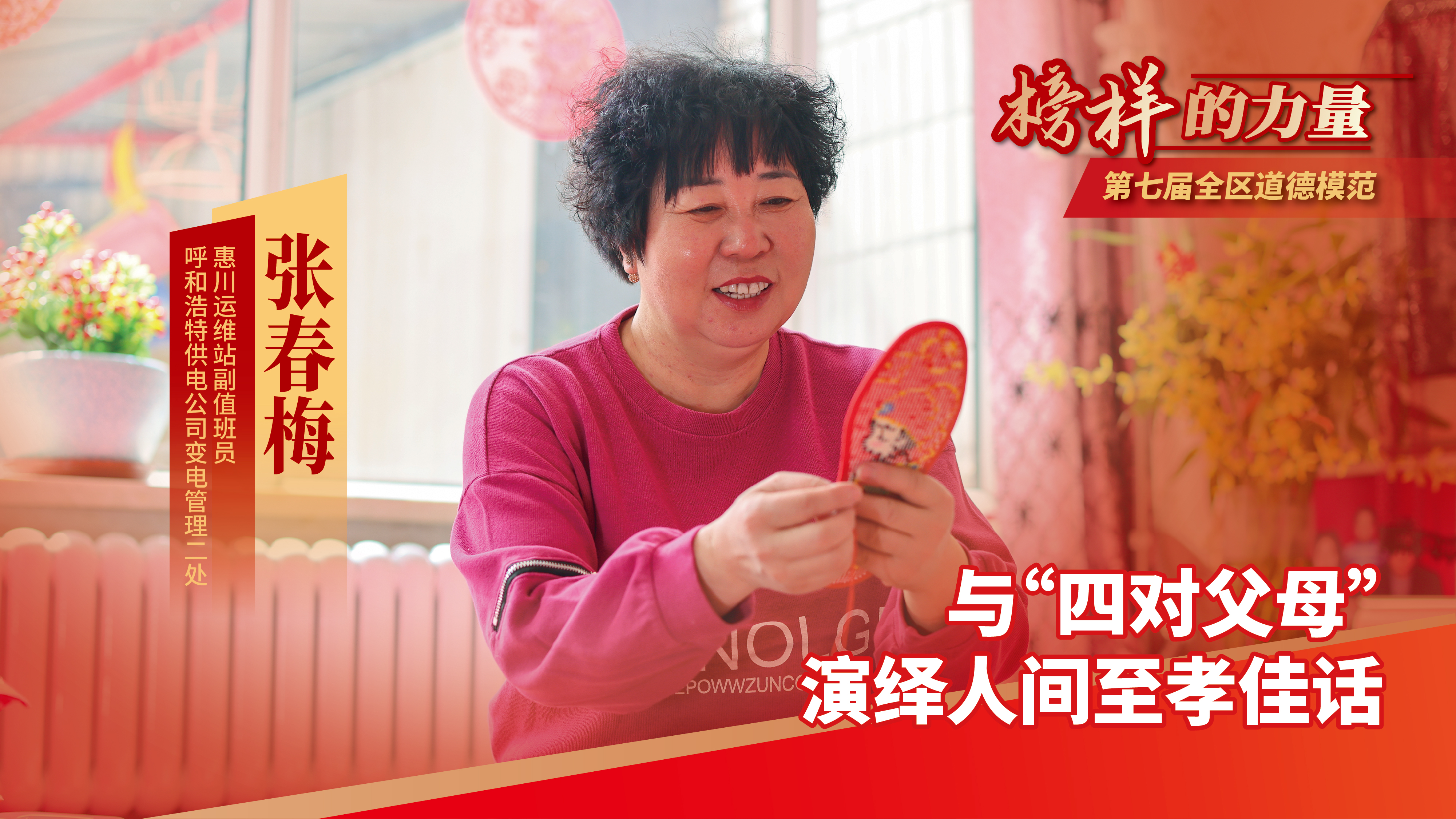 张春梅是呼和浩特供电公司“最美”的一线职工,在岗位上,她尽心尽力、敬业奉献,创造了出色的工作成果;在生活中,她同时赡养8位老人,孝老爱亲,更是民族团结的践行者,她先后获得“内蒙古自治区道德模范”“内蒙古好人”“全区民族团结进步模范个人”“呼和浩特市道德模范”“青城好人”“最美蒙电人”“呼和浩特供电局文明家庭”等荣誉称号。