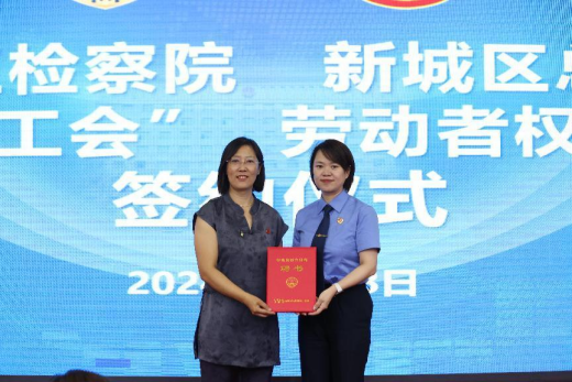 为深入贯彻党中央关于维护劳动者合法权益工作部署,充分发挥检察机关与工会在维护劳动者合法权益中的协同作用,实现检察监督与工会劳动法律监督双向赋能,613日,新城区总工会新城区检察院举行劳动者权益保障座谈交流会暨“检察+工会”劳动者权益协作机制会签仪式。呼和浩特市总工会副主席何一川,市检察院副检察长贾俊梅,新城区人大副主任、工会主席吴红莲,区检察院检察长白静,区总工会党组书记、常务副主席云东升及相关负责同志参加。