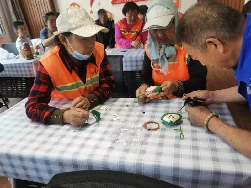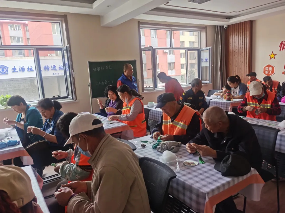 活动当天早上,现场已被五彩斑斓的装饰与清新的艾草香气所包围。赛罕区总工会的志愿者们与社区工作人员早早准备好了制作香包所需的各式材料,以及象征吉祥平安的五彩绳。户外劳动者们在专业人士的指导下,亲手缝制香包,不仅体验了传统文化的魅力,还亲手编织五彩绳,寄托对家人与自己的美好祝愿。