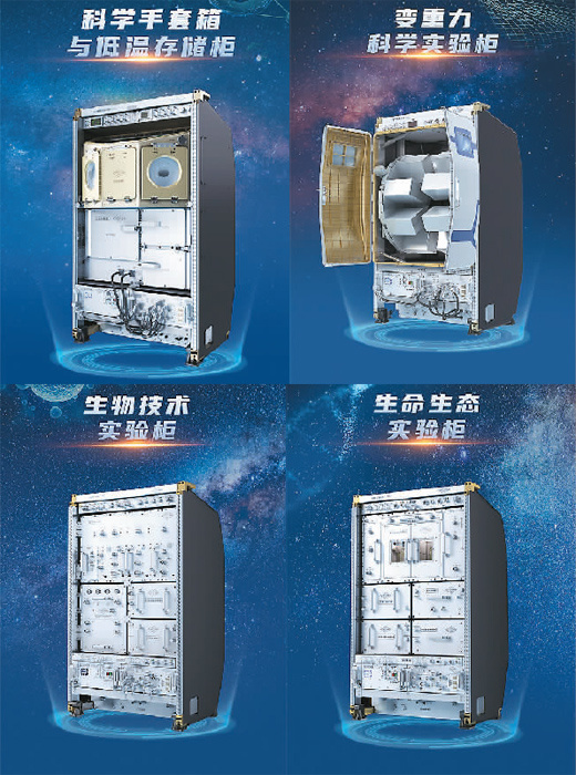 除了无容器材料实验柜之外,天和核心舱内还有高微重力实验柜,为航天医学分析、基础物理研究等提供理想的微重力实验环境。问天实验舱部署了生命生态实验柜、生物技术实验柜、科学手套箱与低温存储柜、变重力科学实验柜以及舱外暴露实验装置等科学实验设施。梦天实验舱则配置了13个标准载荷机柜,目前已装载了超冷原子物理实验柜、高精度时频实验柜、高温材料科学实验柜、两相系统实验柜、流体物理实验柜、燃烧科学实验柜等实验“神器”,主要面向微重力科学研究。