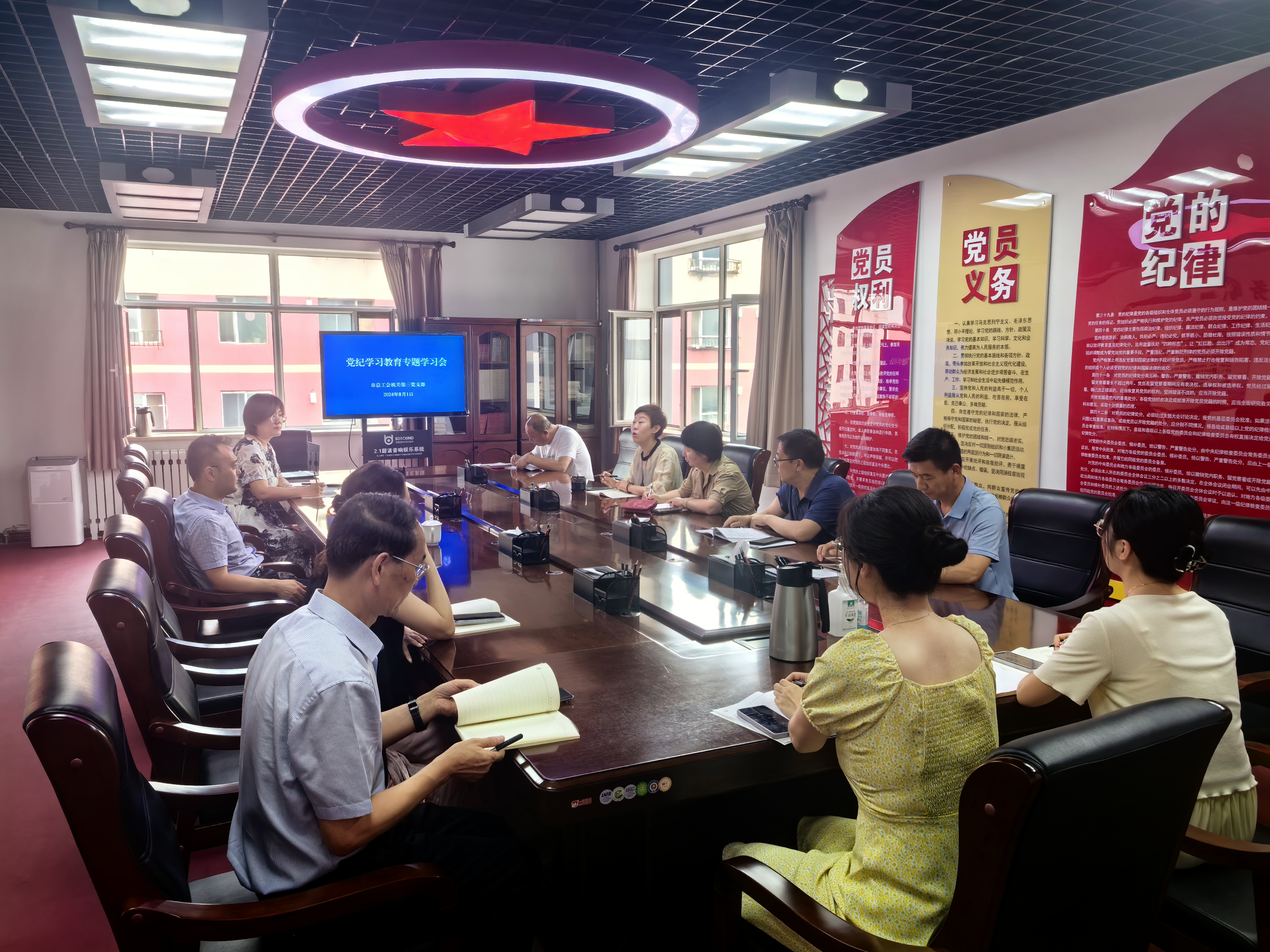 8月1日,呼和浩特市总工会机关第三党支部组织党员开展党纪专题学习会。市总工会党组成员、副主席何一川参加支部学习。