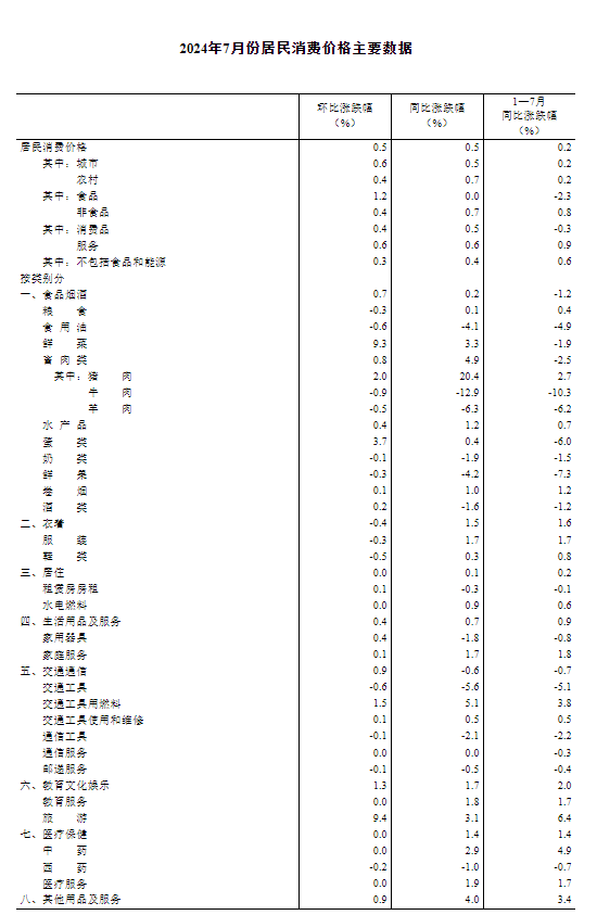 2024年7月份,全国居民消费价格同比上涨0.5%。其中,城市上涨0.5%,农村上涨0.7%;食品价格持平,非食品价格上涨0.7%;消费品价格上涨0.5%,服务价格上涨0.6%。1—7月平均,全国居民消费价格比上年同期上涨0.2%。