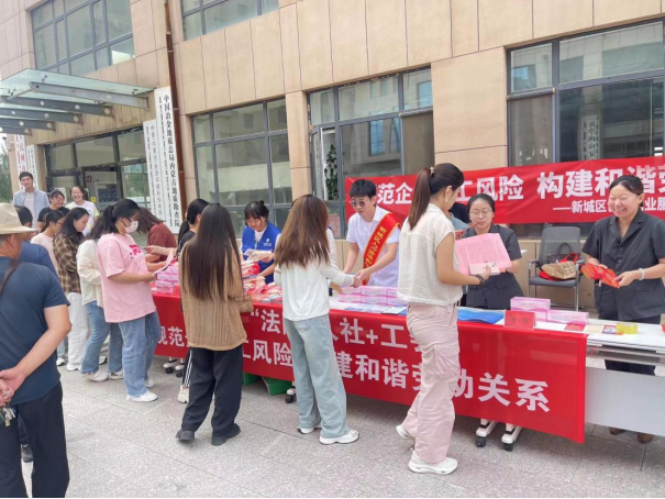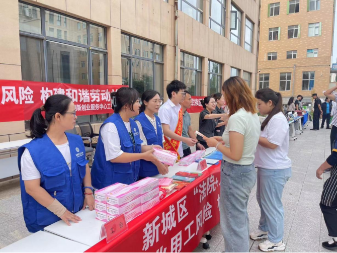 为深入推进构建和谐劳动关系工作,大力宣传劳动关系政策法规,提升广大用工单位与劳动者知法守法意识,从源头上预防化解劳动关系领域矛盾风险,进一步提升广大用工单位与劳动者知法守法意识,切实解决劳动者最关心最直接最现实的利益诉求,维护劳动者合法权益,促进劳动关系和谐稳定,8月14日,新城区总工会联合区人民法院和区人力资源和社会保障局在内蒙古大学生科技园开展“规范企业用工风险,共建和谐劳动关系”为主题的新时代和谐劳动创建宣传活动。