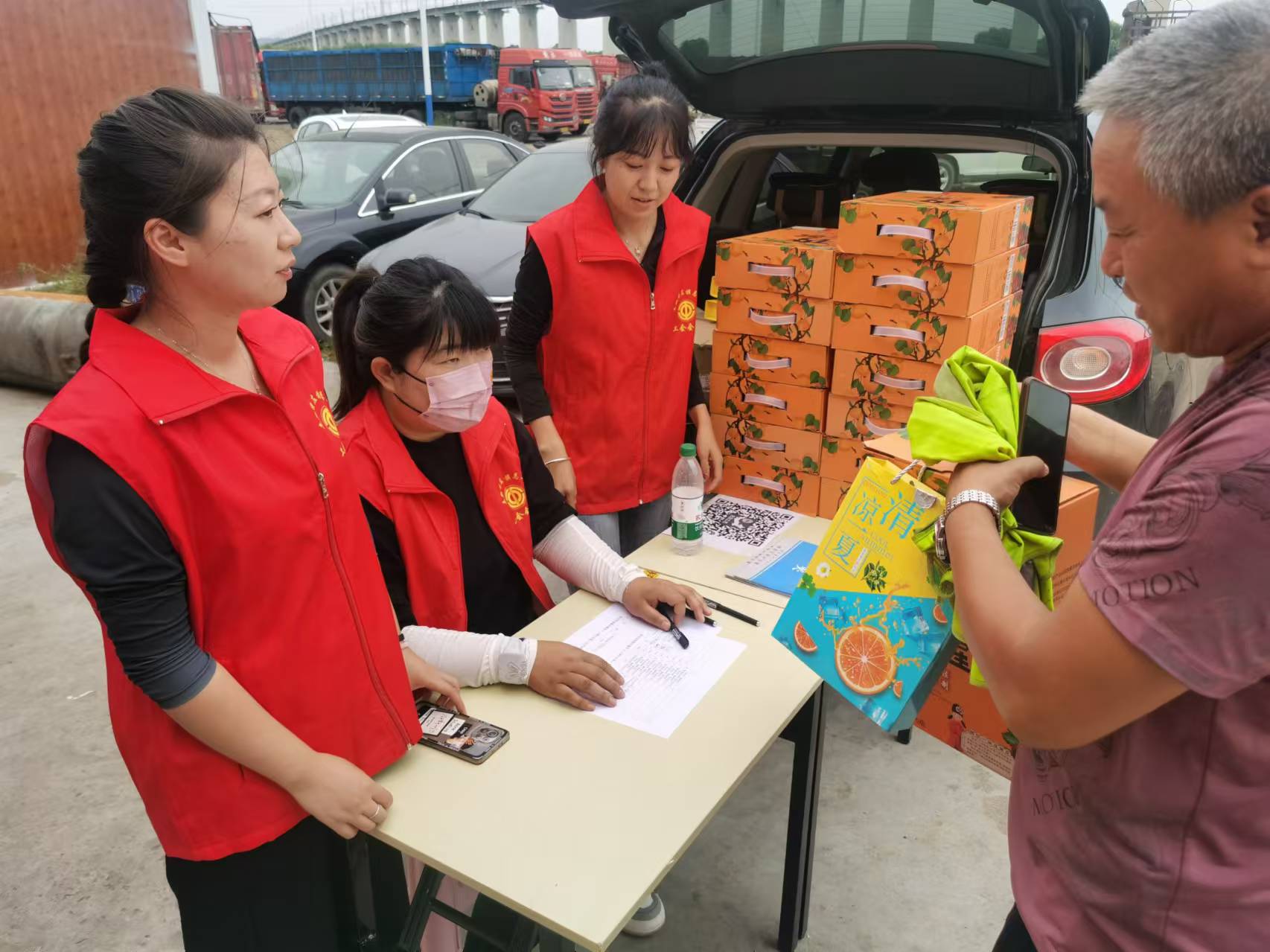连日来,土左旗总工会多措并举关心关爱货车司机,持续推进各项活动,不断提升他们的幸福感。旗总工会领导班子成员多次深入基层开展货车司机入会服务专项行动,针对货车司机群体人数众多、流动性大、挂靠货运公司工作的特点,利用“扫码”入会的方式,在内蒙古伊顺供应链物流园区及货车司机聚集的交通要道、物流企业等区域,组织了8场货车司机入会慰问活动,并为现场新入会的货车司机送上了茶叶、绿豆、冰糖、杏皮茶等防暑物品,让他们感受到炎炎夏日里的清凉。
