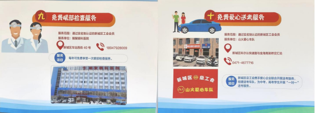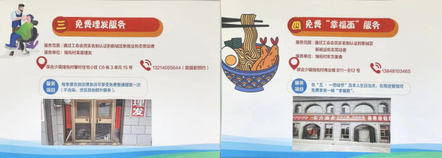 “十项免费政策”是新城区总工会依托辖区资源优势,在前期人大代表走访调研新业态、一线劳动者需求的基础上,联合爱心企业、个体商户、行业联合工会和相关职能部门工会为经过工会实名制认证的新业态、一线劳动者量身定制的暖心服务。服务内容丰富,形式多样,既有眼部护理、心理咨询等身心健康服务,也有观影、理发等休闲生活服务;既有促进有效就业的技能培训、维护合法权益的法律援助,也有五·一劳动节、高考中考季等特殊节点的吃“幸福面”、爱心送考服务,以实际行动为新业态、一线劳动者保驾护航。