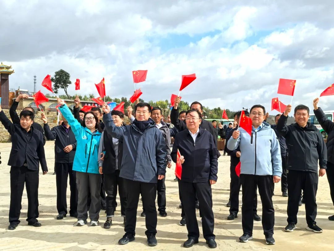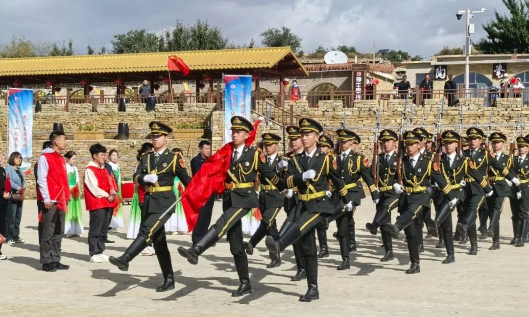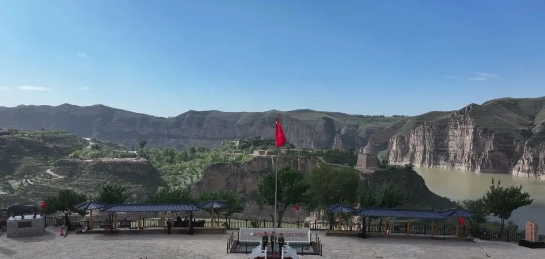 清晨,第一抹金色的阳光温柔地洒在老牛湾神牛广场上,激昂的《威风锣鼓》拉开了演出活动的序幕,瞬间点燃了现场的热烈氛围。仪仗队在《歌唱祖国》的音乐声中庄严入场,他们英姿飒爽,步伐整齐,于国旗台正对面站定。神圣的升国旗仪式开始,10x10 人的左右两方阵整齐列队,仪仗队从中间入场,五星红旗冉冉升起,在五星红旗的映衬下,中华民族的两大符号长城与黄河“握手”的壮美景色一览无余。现场气氛庄严肃穆,来自四面八方的游客、当地居民以及各界代表齐聚广场,面向国旗行注目礼,心中充满了对祖国的热爱和敬意。清水河县总工会的党员干部们身着整齐的服装,以饱满的精神状态参与其中。