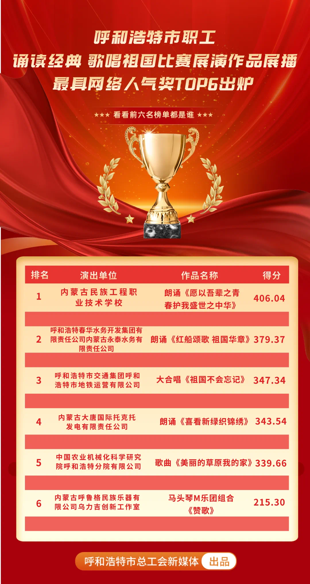 备受瞩目的“中国梦·劳动美--强国复兴有我”呼和浩特市职工诵读经典 歌唱祖国比赛展演作品网络投票评选结果公布啦!