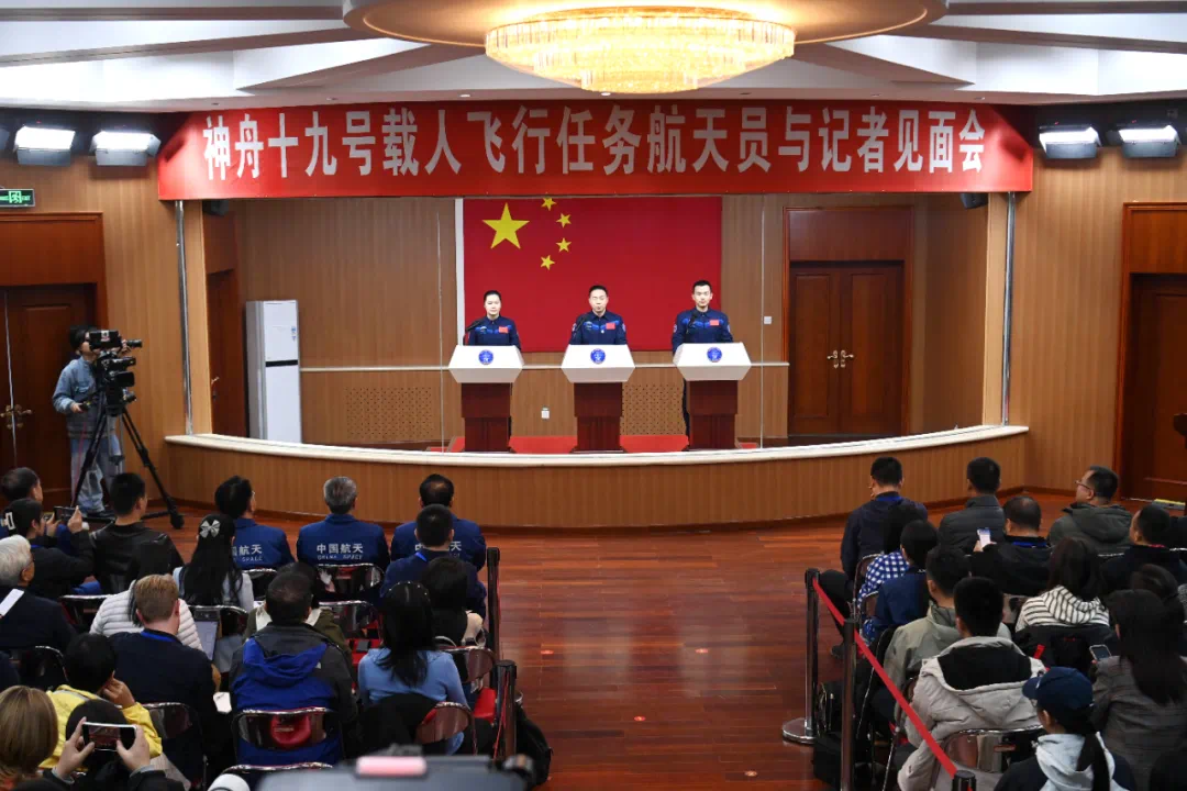 ▲10月29日,神舟十九号载人飞行任务航天员蔡旭哲、宋令东、王浩泽在酒泉卫星发射中心问天阁与媒体记者集体见面。中新社发 汪江波 摄