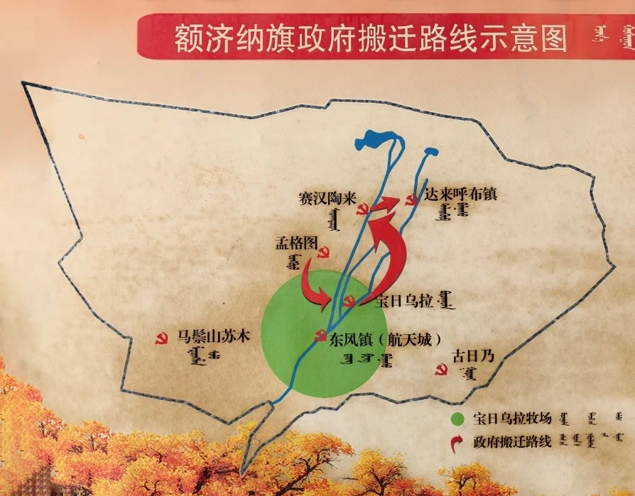 ▲额济纳旗政府为支持祖国航天事业“三易旗府”。上图为旗政府搬迁路线示意图。