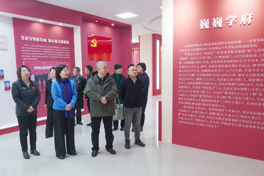随后,调研组一行深入呼和浩特职业学院(内蒙古工匠学院)实地走访了大学生思想政治教育基地、研究中心及各系实训基地,并进行了座谈。