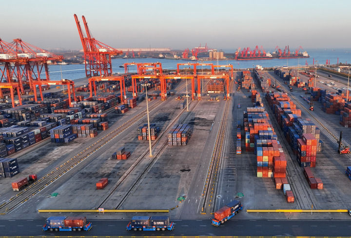 2024年11月5日拍摄的唐山港京唐港区集装箱码头堆场(无人机照片)。新华社记者 杨世尧 摄