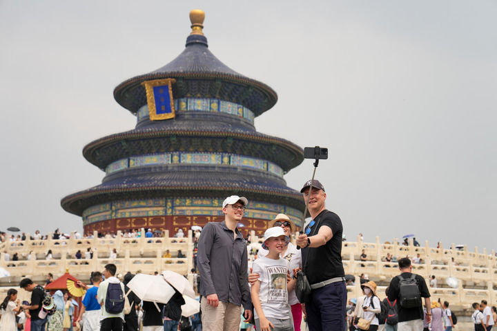 2024年7月9日,来自瑞士的游客在北京天坛公园祈年殿前合影。新华社记者 鞠焕宗 摄