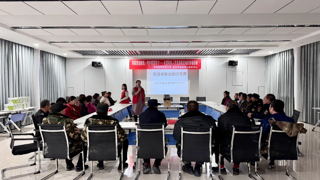 12月16日,呼和浩特市总工会职工志愿服务队在回民区金海路社区举办了“共筑安全防线,守护家园安宁”关爱保安人员送温暖送知识专场活动。活动内容丰富多样,不仅为辖区内的保安人员带来了一场深入浅出的法律知识讲座,还开展了法律和安全相关知识竞赛。此活动旨在提升保安人员的法律素养和安全防范能力,共同守护社区的和谐与安宁。