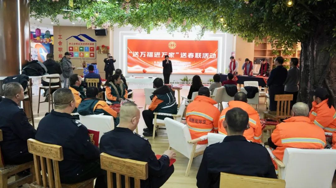 在民族商场星云里的功能型工会驿站,一张张红纸铺满桌面。书法家们挥毫泼墨,笔走游龙,书写着“政通人和千家乐,风调雨顺万户欢”“欢天喜地迎佳节,张灯结彩贺新春”……一幅幅寓意深刻的春联、一张张喜庆吉祥的“福”字跃然纸上,为职工群众送上了一份厚重的“文化年货”。大家纷纷表示:“手写的春联更有年味,这样的活动太贴心了,感觉年味儿一下子就浓了起来!”活动现场,慰问组还为20名环卫工人、新就业形态劳动者、物业工作人员送上了慰问品及节日的祝福。