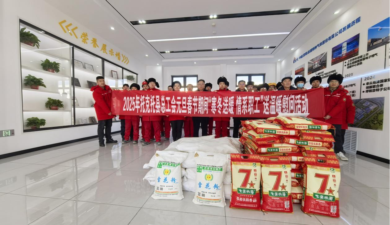 在新春佳节即将来临之际,为进一步做好关心关爱职工,确保他们度过一个欢乐祥和的春节,更好地发挥工会联系职工群众的桥梁纽带作用,把党和政府的关怀、工会组织的温暖及时送到广大职工群众的心坎上,1月16日,托克托县总工会负责人、经济技术开发区负责人深入到我县重点建设项目单位中船派瑞特种气体(呼和浩特)有限公司开展2025年元旦春节送温暖慰问活动。