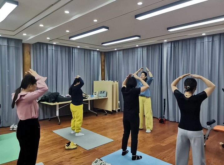 “花开!”随着这一声口令,职工们手臂舒展开来,脸上洋溢着久违的轻松与愉悦。“花落!”口令一出,大家又迅速调整状态,神情专注的为新的动作做准备。
