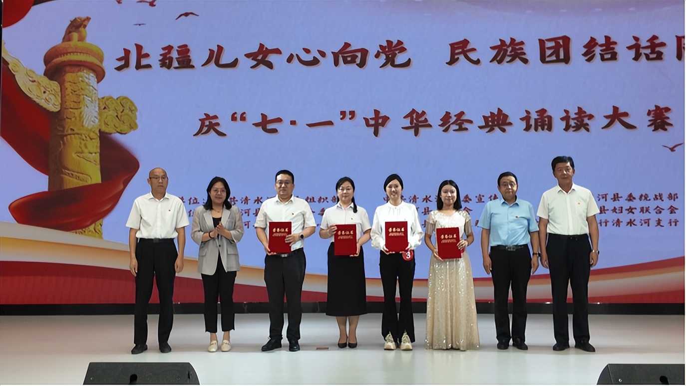 为热烈庆祝中国共产党成立104周年,大力弘扬伟大建党精神,传承红色经典文化,凝聚团结奋进力量,铸牢中华民族共同体意识,7月1日,由清水河县委组织部、县委宣传部、县委统战部主办,县总工会联合县民委、县妇联等多家单位共同承办的“北疆儿女心向党 民族团结话同心”庆“七·一”中华经典诵读大赛圆满举行。