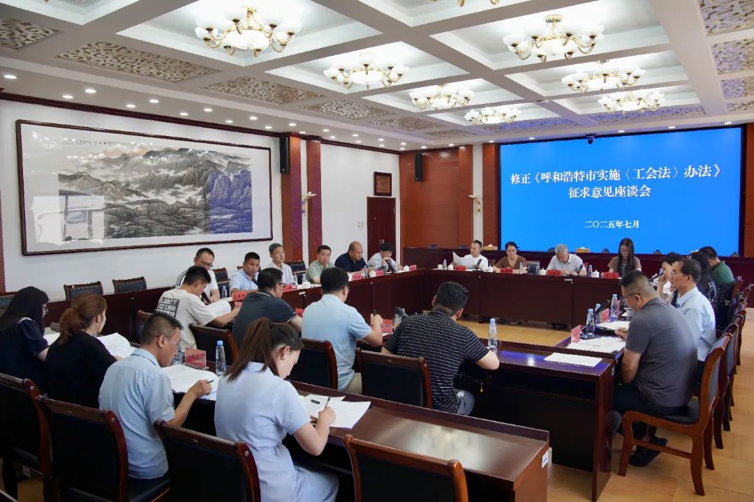 为履行工会参与立法职责,广泛听取社会各方面意见,推进修正《呼和浩特市实施〈中华人民共和国工会法〉办法》工作进程,7月16日,呼和浩特市总工会会同呼和浩特市人大常委会社会工委在市总工会召开专题征求意见座谈会,市人大常委会机关四级调研员王塔娜,市总工会党组书记、副主席汪俊亭出席座谈会。市人力资源和社会保障局、旗县区总工会、基层工会代表、自治区高校相关领域学者、律师以及市总工会有关部门和产业工会负责人参加座谈。市总工会副主席何一川主持会议。