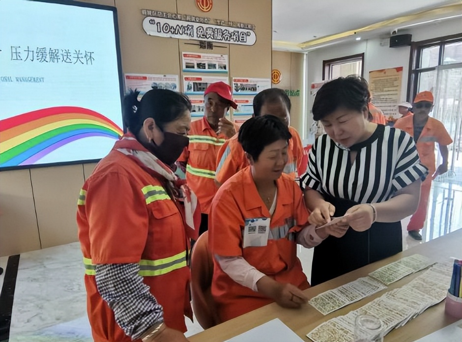 活动通过潜意识投射心灵卡片、心理投射探索的方式,引导职工们释放情绪、减轻压力。活动中,环卫工人们轮流抽取卡片,感知抽到的内容并借由潜意识自由联想展开互动,让参与者觉察当下的情绪状态,引导他们开启自我对话。工人们在轻松的氛围中实现情绪宣泄与认知重构,完成自我赋能,认识到自身成长的潜能。