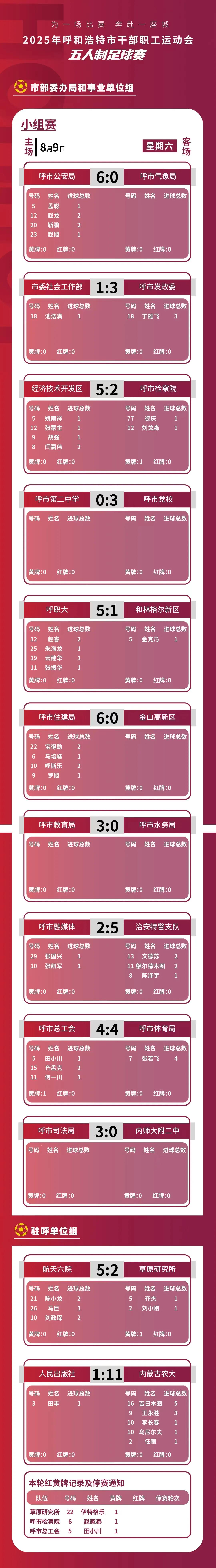五人制足球赛8月9日比赛成绩如下