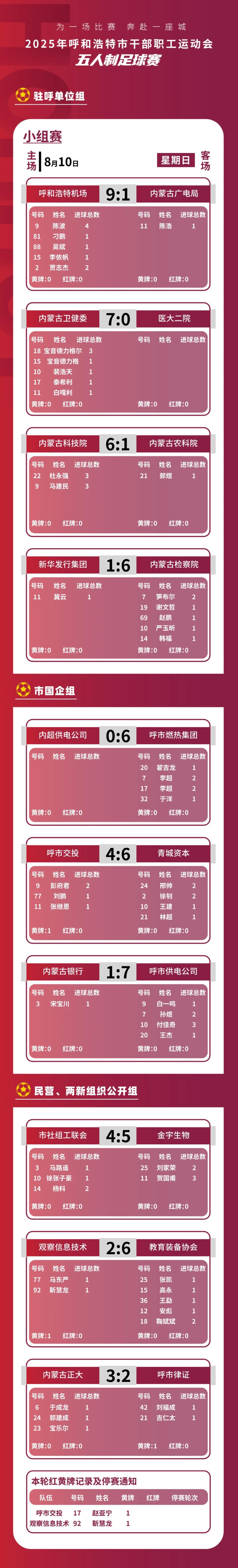 五人制足球赛8月10日比赛成绩如下