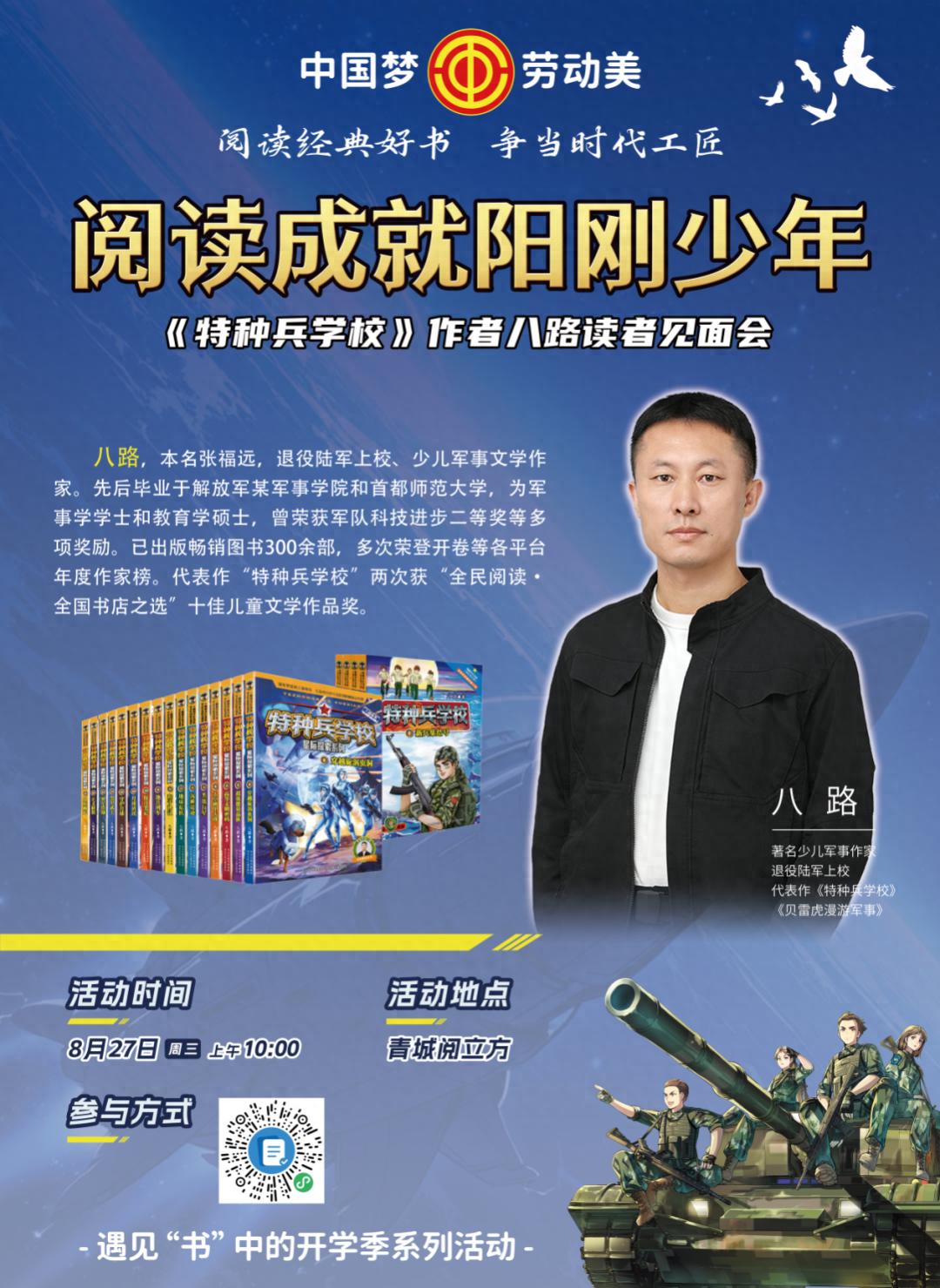 为响应中共中央、国务院、中央军委印发的《关于加强和改进新时代全民国防教育工作的意见》,进一步推动职工家庭亲子共读走深走实。呼和浩特市总工会特邀著名少儿军事作家八路,带来 “强国梦·强军梦--阅读成就阳刚少年” 职工亲子阅读活动。活动现场将以亲子共读军事题材读物为纽带,在生动故事与互动分享中,带领职工与孩子一同感受国防力量、体悟军人精神,既强化职工家庭的国防观念与爱国情怀,也借职工亲子共读时光,培养孩子艰苦奋斗、自强不息的品质,引导孩子树立正确人生观与价值观,让家国情怀在亲子互动中扎根生长。