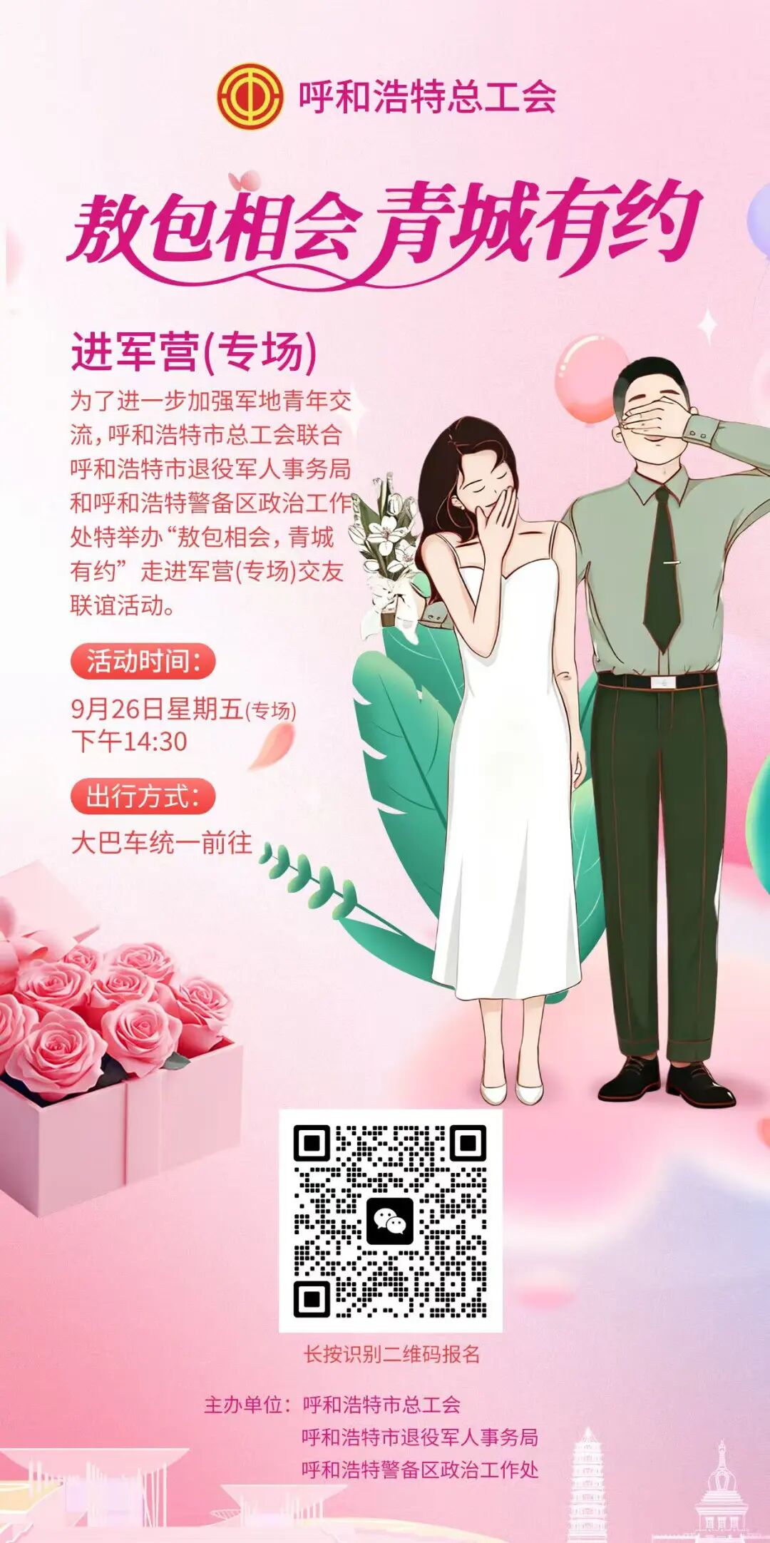 为了进一步加强军地青年交流,拓宽驻呼部队单身官兵与地方单身青年沟通渠道,切实解决青年婚恋交友需求,增强青年群体归属感与幸福感,在第42个民族团结进步活动月期间,呼和浩特市总工会联合呼和浩特市退役军人事务局、呼和浩特警备区政治工作处,举办“敖包相会·青城有约”走进军营(专场)交友联谊活动。