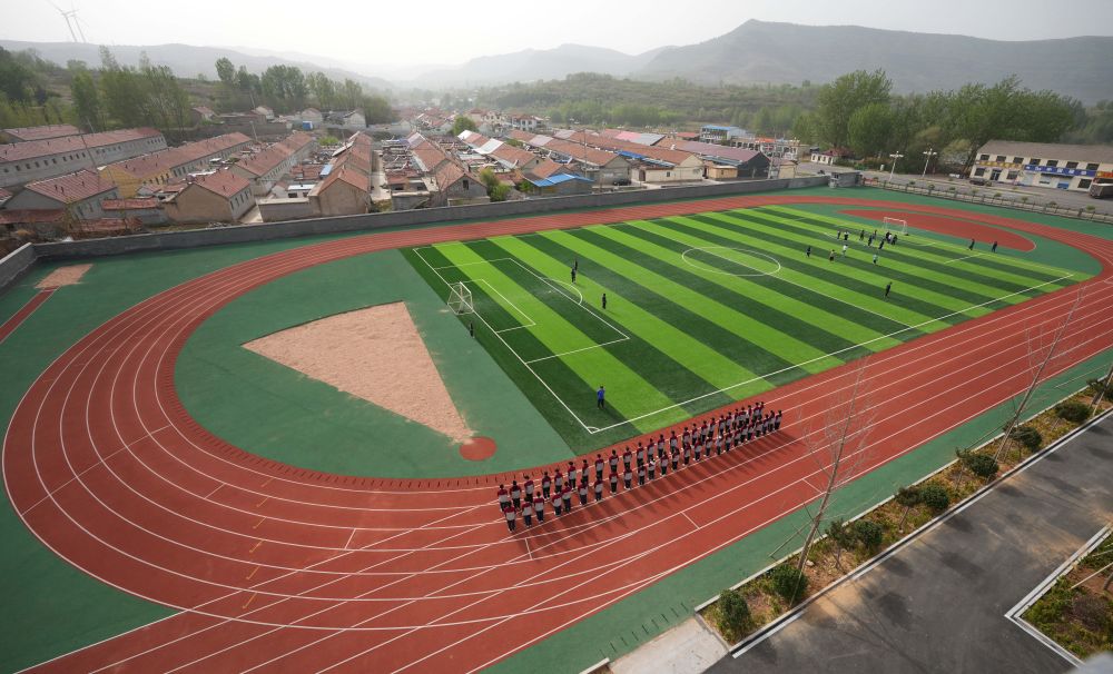 在位于山东潍坊市临朐县石家河村的临朐县弥水教育集团石家河校区,学生在操场塑胶跑道上进行体育锻炼(2025年4月17日摄)。新华社记者 徐速绘 摄